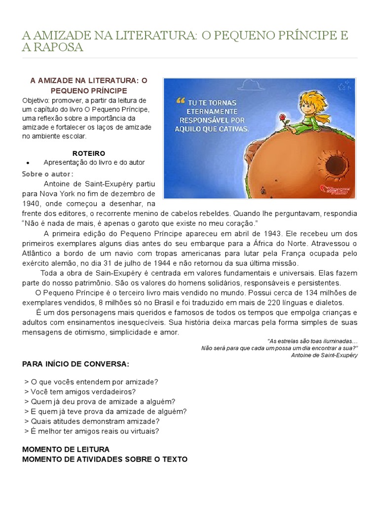 A Amizade Na Literatura O Pequeno Príncipe E A Raposa https://es.scribd.com/document/349155038/A-Amizade-Na-Literatura-o-Pequeno-Principe-e-a-Raposa